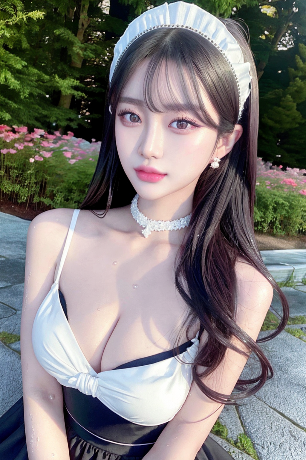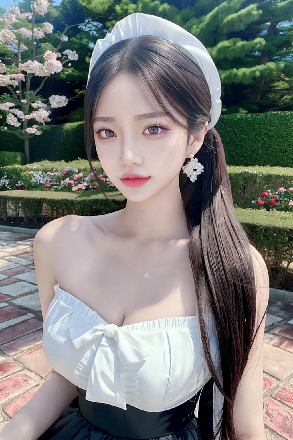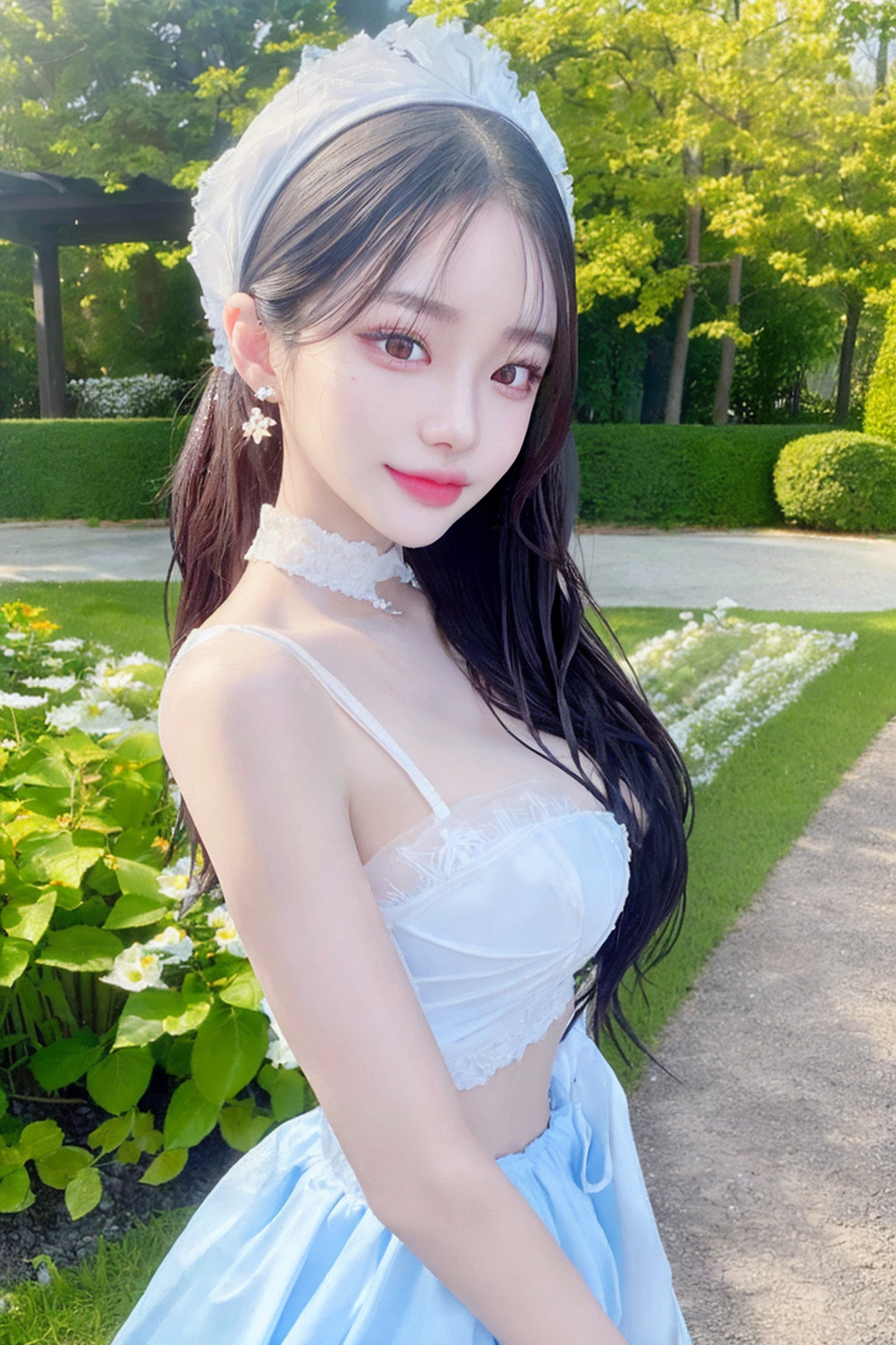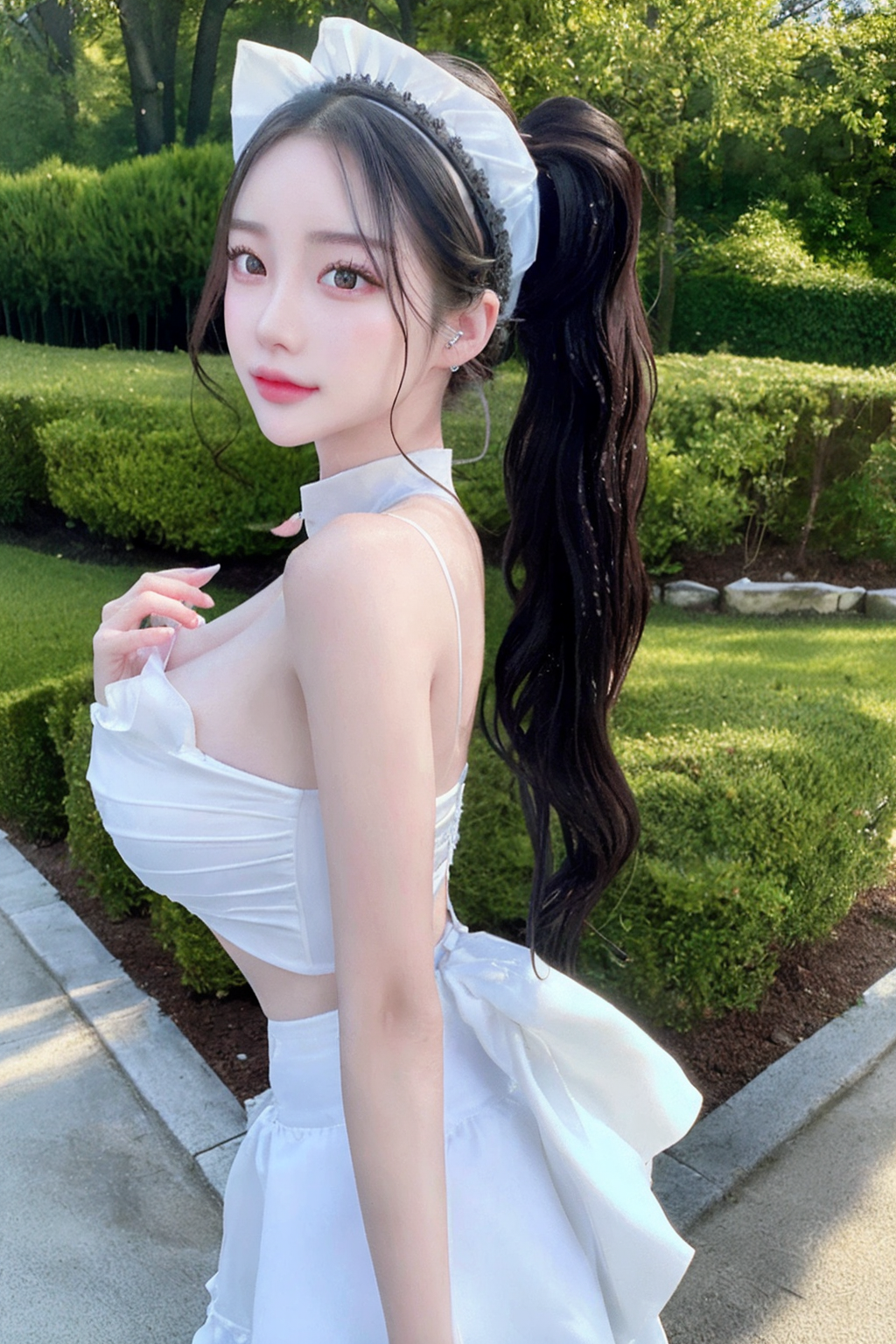 ((maid skirt)), maid headdress, maid apron, rozen maiden, chocker, earings, chignon hair, realistic glistening skin, seductive smile, high detailed oiled skin, ponytail, side ponytail, high ponytail, low ponytail, blue eyes,