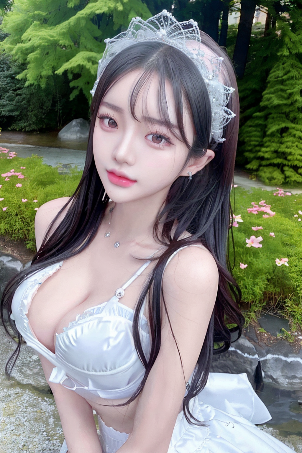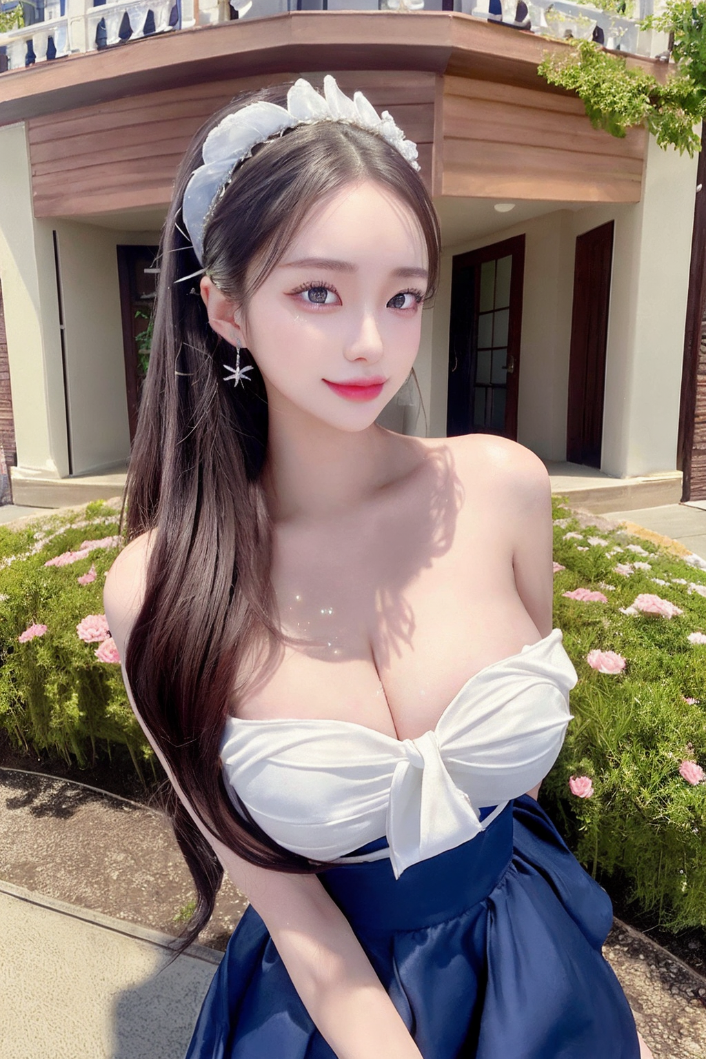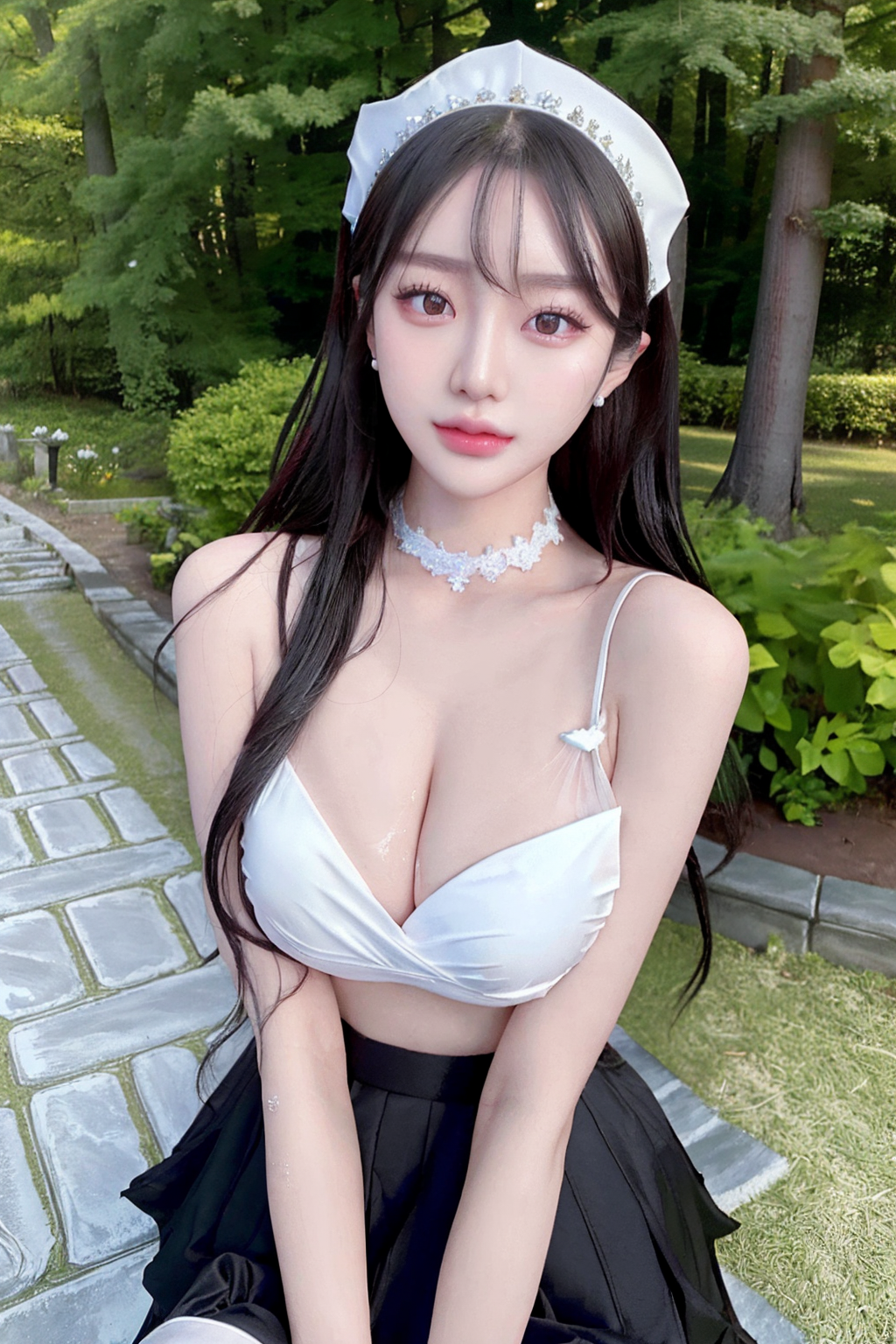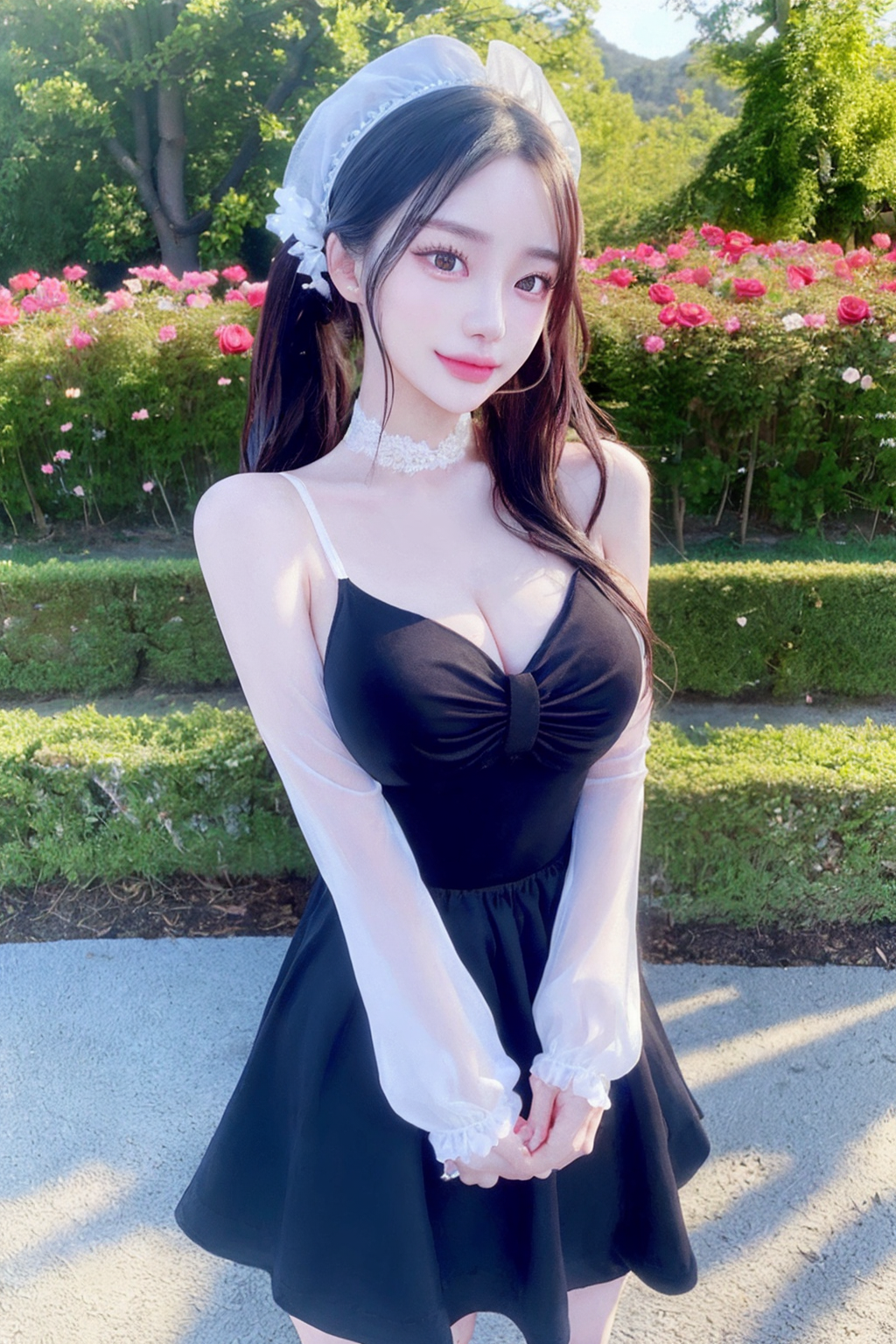 ((maid skirt)), maid headdress, maid apron, rozen maiden, chocker, earings, chignon hair, realistic glistening skin, seductive smile, high detailed oiled skin, ponytail, side ponytail, high ponytail, low ponytail, blue eyes,